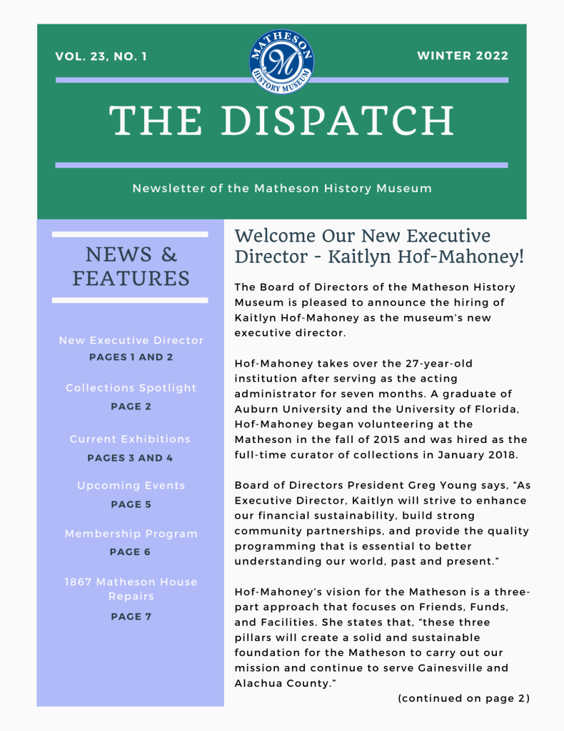 The Matheson is an inclusive hub for preserving and interpreting the history of Alachua County. As a cultural fixture, for over 30 years we have maintained a link with the past through our collections and historic buildings. The Matheson is a leader in cultivating our shared history and enriching the quality of diverse programming through our partnerships, programs, exhibits, and collections. Through collaborations with local organizations and leaders, and the Alachua County community, we create spaces for understanding, discussing, and interpreting the meaning of our shared experiences.